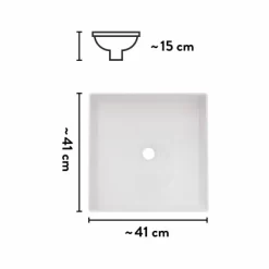 Durch die kompakten MaĂe mit 41 cm x 41 cm (B x T) und einer Höhe von 15 cm kannst du das Aufsatzwaschbecken gut auch in kleinen BĂ€dern und GĂ€ste-WCÂŽs anbringen. Montieren kannst du dein Waschbecken auf stabilen Platten, Waschtischen oder UnterschrĂ€nken in passender GröĂe. Das Becken wurde ohne Hahnloch und Ăberlauf gefertigt. So entsteht eine Optik „wie aus einem Guss“. Du kannst es mit einer Wandarmatur oder einer Armatur mit hohem Auslauf, die neben dem Waschtisch montiert wird, ergĂ€nzen. Besonders wichtig: da das Waschbecken keinen Ăberlauf hat, solltest du es nur mit einem nicht verschlieĂbaren Ventilen verwenden. So kann das Wasser nicht versehentlich ĂŒbertreten.