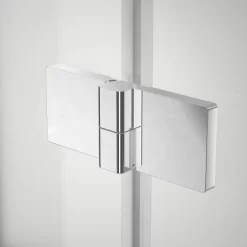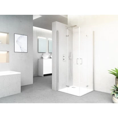 Durch ihre einklappbaren FalttĂŒren ist diese Eckdusche besonders platzsparend und auch fĂŒr kleinere Badezimmer bestens geeignet. Die hochwertige QualitĂ€t zeigt sich neben dem Einscheibensicherheitsglas in 6 mm StĂ€rke in den formschönen Scharnieren und den verchromten teilgerahmten Aluminiumprofilen.