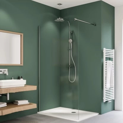Die Entra Duschwand Walk In aus 6 mm Einscheibensicherheitsglas ĂŒberzeugt durch reinigungsfreundliche, groĂe GlasflĂ€chen. Ein groĂer Einstieg garantiert den mobilen Zugang zum Duschbereich.