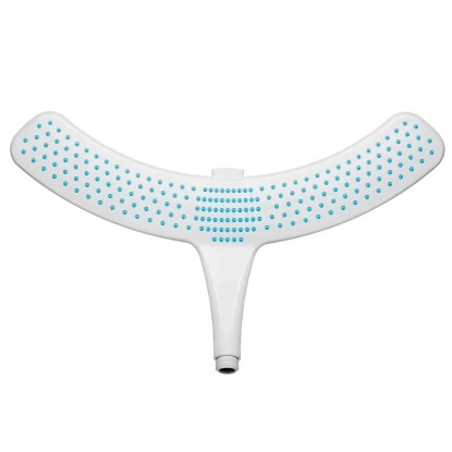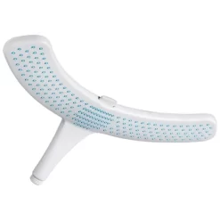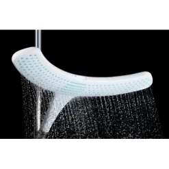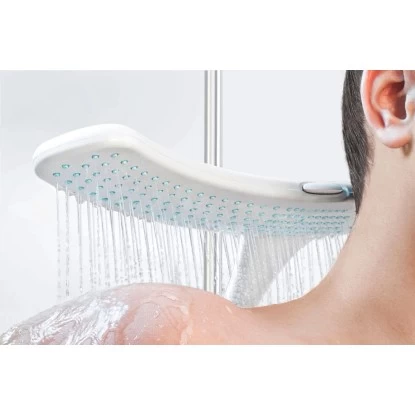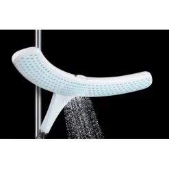Komfortabel duschen, ohne dass dabei Ihre Haare nass werden? Mit dem Duschkopf Doosh von Stefan Raab kein Problem mehr. Auf Schulterhöhe eingestellt ermöglicht Ihnen der breite Wasservorhang aus 204 StrahldĂĽsen ein angenehmes Wellness-Duschen – und die Haare bleiben trocken. Durch den angenehmen Wasservorhang spritzt das Wasser nicht hoch und Ihre Schultern werden gleichmäßig nass und warm. So können Sie zum Beispiel auch ganz entspannt Ihre Haarkur einwirken lassen. Zum Haarewaschen stellen Sie ganz einfach per Knopfdruck auf den zentralen Powerstrahl um. Doosh ist sparsam im Wasserverbrauch und wird aus kontrollierten Materialien in Deutschland hergestellt. Der Design-Duschkopf passt auf jeden handelsĂĽblichen Anschluss. Der Austausch dauert weniger als 1 Minute.