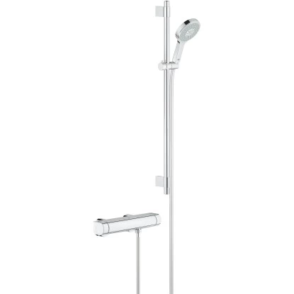 Die Grohe Thermostat-Brausebatterie mit Brausegarnitur wertet Ihre Dusche elegant auf. Die hochwertige Grohe StarLight OberflĂ€che in Chrom ĂŒberzeugt mit einer sanften LinienfĂŒhrung und passt sich harmonisch nahezu jedem Badezimmer an. Die StarLight OberflĂ€che sieht nicht nur besonders gut aus, sondern ist auch sehr resistent gegenĂŒber Kratzern und von daher sehr pflegeleicht. Die Handbrause hat einen Durchmesser von 130 mm und sorgt dank ihrer hohen FunktionalitĂ€t fĂŒr traumhafte Duschmomente.