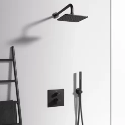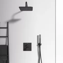 Der Ideal Standard Badethermostat Ceratherm C100 und sein aussagestarkes kubistisches Design. Dieses Thermostat verfĂŒgt ĂŒber eine Absperrung und Umstellung, mit der Sie zwischen den beiden angeschlossenen Verbrauchen wechseln.