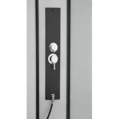 Die moderne Sanotechnik Komplettduschkabine Sky 1 CL73 ĂŒberzeugt durch das ausgefallene Design im Schwarz-WeiĂ Look und ist ein absoluter Blickfang in Ihrem Badezimmer. Ein optisches Highlight ist vor allem das edle Glasdach der Duschkabine. Diese Dusche ermöglicht ein unvergessliches Duscherlebnis und lĂ€sst Sie Ihre Alltagssorgen vergessen. Die groĂflĂ€chigen MassagedĂŒsen sorgen fĂŒr die ideale Entspannung nach einem stressigen Tag. Zudem ist die Dusche mit einer Ăberkopfbrause sowie mit einer verstellbaren Handbrause mit 3 Funktionen ausgestattet. Mit Hilfe des Einhebelmischers können Sie bequem zwischen den beiden Brausen umschalten. Auf der integrierten Glasablage ist auĂerdem Platz fĂŒr Ihre Duschutensilien. Dank des Quick Line Montagesystems wird ein schneller und leichter Aufbau der Duschkabine garantiert.