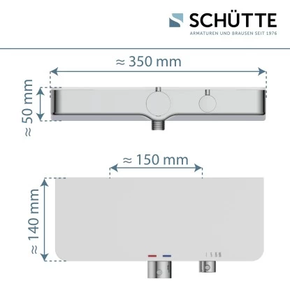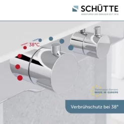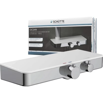 Die Schütte Thermostat-Duscharmatur Ocean überzeugt durch das moderne Design in elegantem Chrom-Weiß. Auf der praktischen Ablage haben Sie zudem Platz für Ihre Dusch- und Badutensilien. Dies stellt besonders für Duschbereiche mit geringem Platzangebot einen tollen Mehrwert dar. Die Duscharmatur ist mit einem Thermostatelement ausgestattet, welches für eine gleichmäßige und komfortable Temperaturregulierung sorgt. Zudem wird dank der integrierten Sicherheitssperre bei 38 °C das Risiko für Verbrühungen minimiert. Die Armatur verfügt über einen Standard-Brauseschlauchanschluss G 1/2. Dank strenger Qualitätskontrollen und hochwertigen Materialien, die den Bestimmungen der deutschen Trinkwasserverordnung entsprechen, wird eine hohe Sicherheit und beste Wasserqualität garantiert. Das mitgelieferte Montageset und die leicht verständliche Montageanleitung machen die Installation zum Kinderspiel.