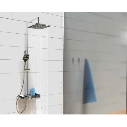 Das Überkopfbrause-Set Blueperl Chrome Schwarz mit Ablage besteht aus hochwertiger Edelstahl-Duschsäule mit einer variablen Höhe von 125-145 cm in trendstarken kubischen Design mit Hochwertigen Edelstahl-Brauseschlauch und Anschlussschlauch an die Armatur mit Standard 1/2 Zoll Anschluss. Großformatige, flache Kopfbrause sorgt für pures Duschvergnügen. Viel Stauraum für Duschutensilien bietet die elegante Ablage in Chrom-Schwarz. Für variable Höhe sorgt ein stilvoll integrierter Push-Button. Praktisch gelöst ist die Ablage in modularer Steckausführung es ist nur durch einfaches Umstecken seitlich tauschbar. Anti-Kalk-Noppen an Kopf- und Handbrause sorgen für die einfache Entfernung von Kalkrückständen. Produktdetails: