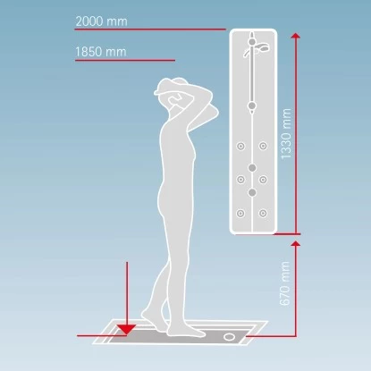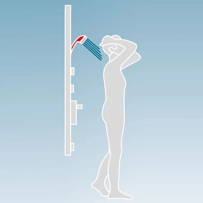 Der Dusch Master besitzt ein +38 °C Sicherheits-Thermostat sowie eine elegante Tellerkopfbrause. Der Korpus besteht aus Aluminium. Die MassagedĂŒsen sind justierbar. Die Handbrause mit 3 Strahlarten lĂ€sst sich leicht reinigen.