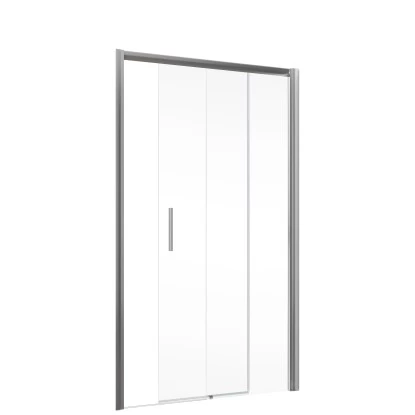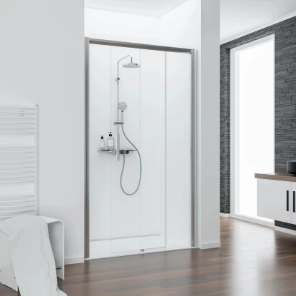 Die Schiebetür an feststehender Seitenwand Kristall/Trend wird ohne unteres Profil geliefert und ermöglicht dadurch einen komfortablen Einstieg ohne lästige Schwelle. Das Festteil befindet sich auf der rechten Seite, die dazugehörige Seitenwand wird links montiert. Durch das platzsparende Öffnen ist die Schiebetür auch für kleinere Bäder optimal geeignet. Das 8 mm starke Sicherheitsglas und die stabilen Aluminiumprofile verleihen der Dusche einen sicheren Stand.