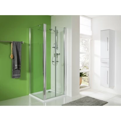 Die Seitenwand Visolo 80 komplettiert Ihre Dusche auf stilvolle Art und Weise. Sie ist aus klarem 6 mm starkem Sicherheitsglas gefertigt und mit einem edlen Aluminiumprofil in Chromoptik versehen. Als besonders praktisch erweist sich der innenseitige Abperleffekt, wodurch diese sich leichter reinigen lÀsst.