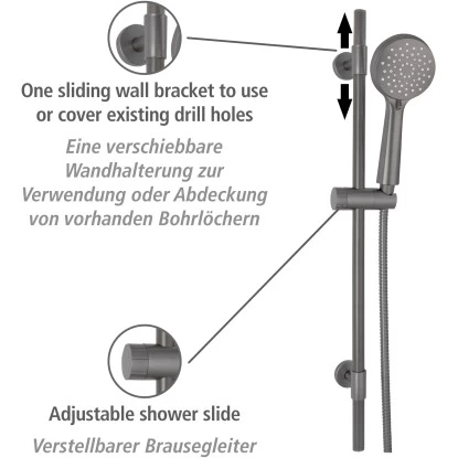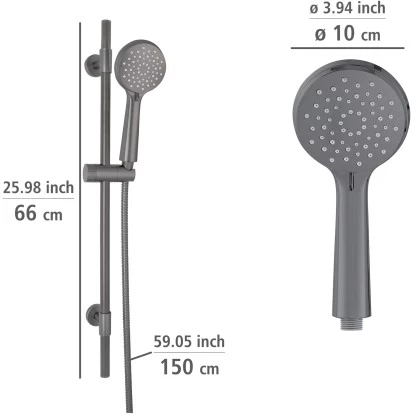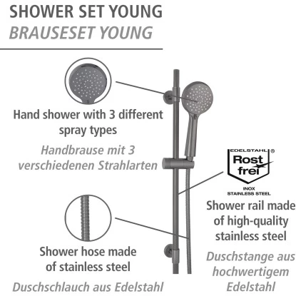 Das ideale Duscherlebnis ganz nach Ihren WĂŒnschen bietet das Brauseset Young von WENKO in der Farbe Gunmetal Grey. Das Set besteht aus einer Duschstange, einem Duschschlauch und einer Handbrause mit 3 verschiedenen Wasserstrahl-Arten, die individuell ausgewĂ€hlt werden können.