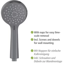 Entspannt gelingt auch die Reinigung des Duschkopfes mit Ă 10 cm aus ABS-Kunststoff. Seine Noppen ermöglichen eine einfache Reinigung. KalkrĂŒckstĂ€nde können mit den Fingern abgerieben werden. Die Handbrause verfĂŒgt ĂŒber einen œ“ Universalanschluss und ist fĂŒr Durchlauferhitzer geeignet. ErgĂ€nzt wird die graue Kombination durch einen passenden Duschschlauch (150 cm) aus Edelstahl mit einem œ“ Standardanschluss. Der Schlauch ist belastbar, dehnbar und knickfest.
