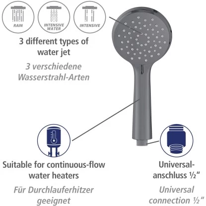 Kaum WĂŒnsche offen lĂ€sst der moderne Duschkopf. WĂ€hlen Sie aus 3 Funktionen und genieĂen Sie ein wohltuendes Duscherlebnis. Entspannen Sie unter einem warmen Regenschauer oder mit dem belebenden Intensive Water. Ein krĂ€ftiger Intensive-Strahl sorgt fĂŒr zusĂ€tzliche Wellness-Momente.
