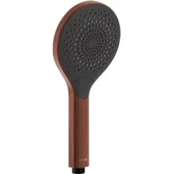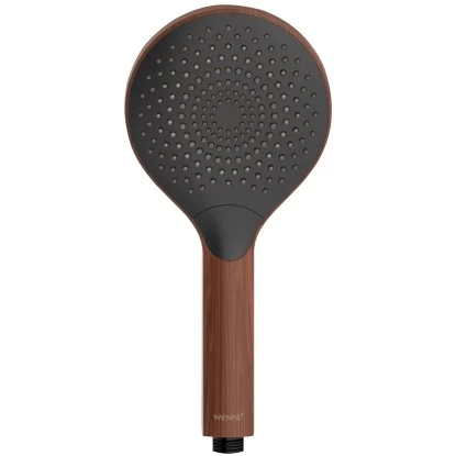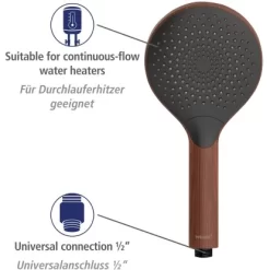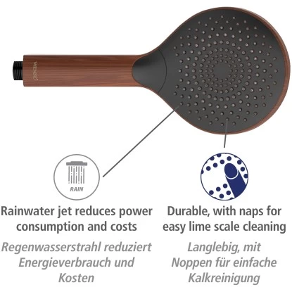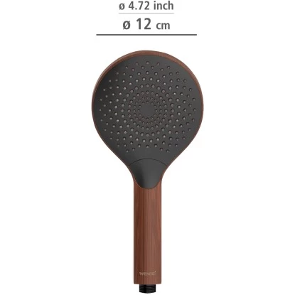 Die Handbrause mit einem Durchmesser von Ă 12 cm besteht aus stabilem Kunststoff (ABS). Sie ist leicht zu reinigen und damit besonders langlebig. Kalkablagerungen können von den praktischen Noppen am Brausekopf einfach mit den Fingern abgerieben werden. Der Duschkopf Watersaving Wood verfĂŒgt ĂŒber einen Universalanschluss mit 1/2 und ist auch fĂŒr Duschen mit Durchlauferhitzer geeignet. Nicht nur funktional ĂŒberzeugt der wassersparende Duschkopf, auch optisch macht die Handbrause in edlem, dunklen Holz-Design Eindruck. Der natĂŒrliche Look liegt voll im Trend und kreiert in Ihrem Badezimmer eine AtmosphĂ€re zum WohlfĂŒhlen und Entspannen. Durch die Farbkombination mit Schwarz wirkt die Brause zudem sehr elegant. Einen passenden Duschschlauch und eine Duschstange in Schwarz finden Sie ebenfalls bei Wenko.