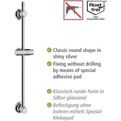 Wer Bohrlöcher vermeiden möchte oder muss, liegt mit der Wenko Duschstange Chrom genau richtig. Wie der Name schon verrĂ€t, gelingt die Montage der Brausestange ganz ohne die Bohrmaschine. Innerhalb von Minuten wird die Stange mithilfe eines Spezial-Klebepads und innovativen Wandhaltern an der gewĂŒnschten Stelle befestigt. Die Duschstange ohne Bohren ist aus hochwertigem, rostfreiem Edelstahl hergestellt und verfĂŒgt ĂŒber einen integrierten Halter fĂŒr den Duschkopf. Die Handbrause lĂ€sst sich so ganz leicht auf die gewĂŒnschte Höhe verschieben, um Ihnen ein entspanntes Duscherlebnis zu ermöglichen. Die Brausestange misst insgesamt (B/T x H): Ă 2,2 cm x 70 cm.
